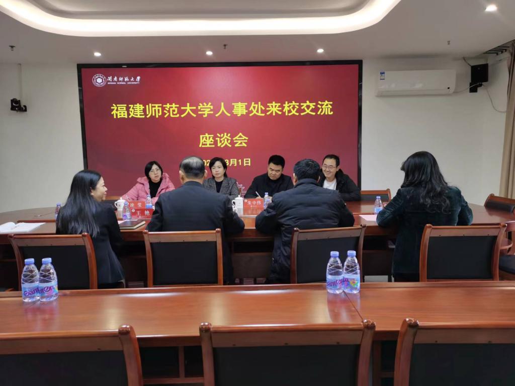 3月1日,福建师范大学人事处处长章琳一行来我校交流。座谈会在科技楼北1507会议室举行,yl34511线路中心(人事处)处长黄伟东、分管副处长及相关职能科室负责人参加座谈会。