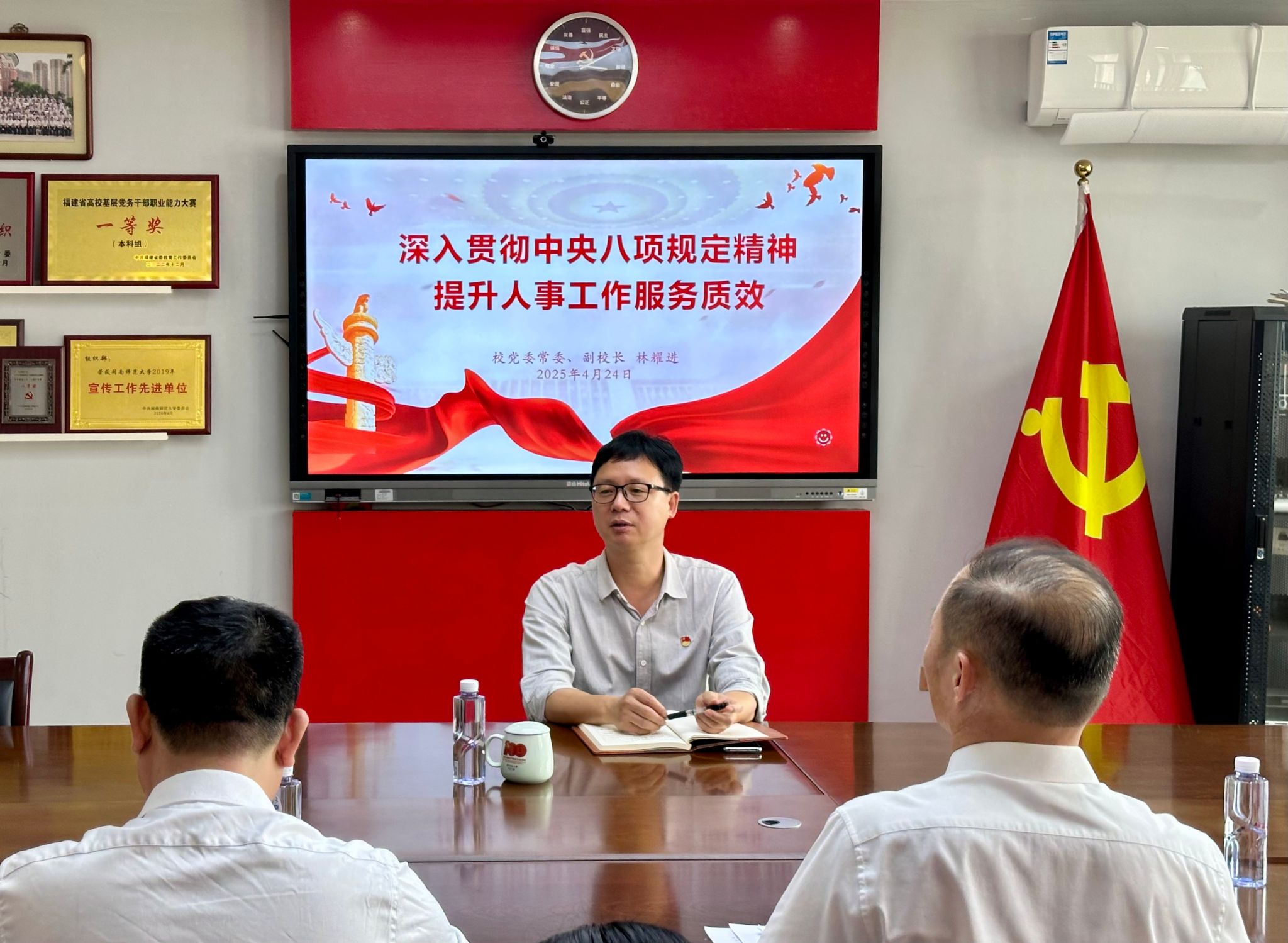 4月24日下午,校党委常委、副校长林耀进为yl34511线路中心党支部讲授题为《深入贯彻中央八项规定精神 提升人事工作服务质效》的专题党课。
